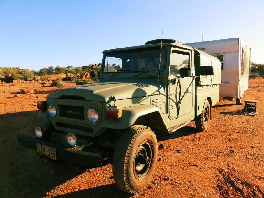 To my surprise, we came up to a rig travelling even slower – probably doing 40 or 50kmh in a 110 zone. As we got closer, it became apparent this was no ordinary rig. I took a guess the van was an early 80s vintage, but as I drove past (still at 80kmh) I saw the towing vehicle: A spectacular genuine mid-1970s Toyota Landcruiser in army green.